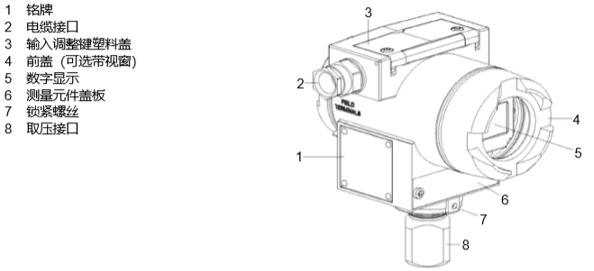 西門子壓力變送器正面的表蓋(4,圖 3)可以選用帶有玻璃視窗,用于直接讀出數(shù)字表頭上顯示的測量值。 電纜接口(2,圖 3)位于變送器的接線側(cè),即可以在左側(cè)也可以在右側(cè)。不用的一側(cè)配有密封蓋。