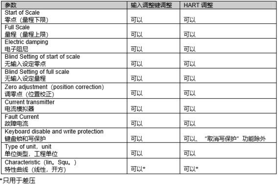 西門子壓力變送器參數(shù)的調(diào)整可以在現(xiàn)場通過儀表自身配備的三個(gè)輸入調(diào)整鍵實(shí)現(xiàn),也可以通過HART 協(xié)議外部實(shí)現(xiàn)。以下表中列出的為上述可實(shí)現(xiàn)的基本參數(shù)。其它用于特別用途的參數(shù)可以通過 HART 協(xié)議調(diào)整。