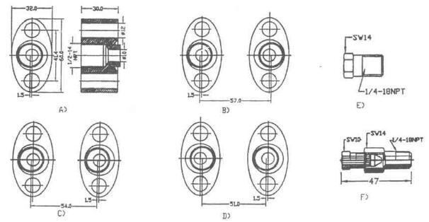 差壓變送器法蘭為1/4" -18NPT錐管連接螺紋。引壓管線可以通過1/4" -18NPT錐管連接管頭直接安裝在差壓變送器法蘭上,正負(fù)兩根引壓管間距為54mm。這種安裝方式雖然簡單但不利于差壓變送器調(diào)整和拆卸;引壓管線也可以通過三通閥安裝在差壓變送器法蘭上(三通閥須自備或特別定購),引壓管線也可以通過橢圓法蘭安裝在差壓變送器法蘭上,橢圓法蘭為1/2”-14NPT錐管連接螺紋,通過擰下橢圓法蘭固定螺桿,使差玉變送器很方便地從工藝流程引壓管線上拆下來??梢酝ㄟ^橢圓法蘭改變引壓管徑,也可通過改變-一個或個橢圓法蘭尺寸, 圖B) C)D)為橢圓法蘭不同安裝角度尺寸。圖E) F)為EJA差壓變送器法蘭密封絲堵和放氣排污閥。注:橢圓法蘭、密封絲堵和放氣排污閥為選購件。